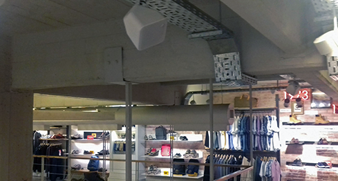 El sistema de música funcional de 6punto1 se concibe como parte fundamental de la experiencia de compra en los locales de Grimoldi. La empresa analizó en este caso la superficie a cubrir en cada local y sus características acústicas particulares. De esta manera se determina la cantidad de parlantes necesaria para generar un sonido homogéneo, y que los clientes no perciban diferencias de volúmen el sectores distintos de los locales.