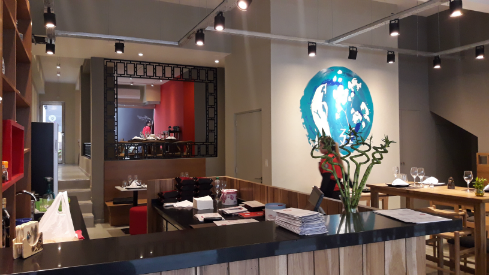 En cuanto al layout, el desafío estuvo en poder convivir con una dinámica de delivery y take away con un ambiente sereno para el restaurant, por tal motivo la arquitectura del local propone un semi cubierto que acerque la puerta al mostrador que se interpone entre el acceso y el resto del sitting, de esta manera se genera un lugar de espera para el take away y delivery, para luego dar lugar a la disposición de las mesas. Al final del salón, se ubica una amplia cocina donde el sector del fuego, gran protagonista de la gastronomía china, se deja ver desde el patio.