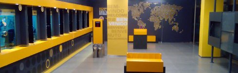 En la parte interna se combinan el negro plomo y el amarillo en una distribución muy funcional que identifica la zona de espera y la línea de cajas numeradas, con una logística similar a la de un banco. El estilo del local remite al de un aeropuerto, con la presencia de un mapa que refleja la internacionalidad del servicio de Western Union, carteles en varios idiomas y los círculos característicos de Pago Fácil. El piso de porcelanato gris aporta claridad, y la iluminación superior de led.