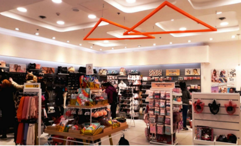 Los sistemas de exhibición se adaptan a la forma irregular en la que se distribuye el espacio, ubicándose en los laterales y en pequeñas góndolas en el centro. En el fondo izquierdo se encuentra el sector de caja.