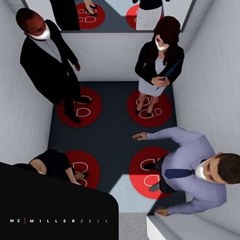 Una de las soluciones que propone Miller Zell es el uso de Señalética, es decir, la utilización de opciones de gráfica para zonas compartidas con información preventiva y normativa, para aplicar en pisos, cartelería colgante o adherible a paredes, conos.