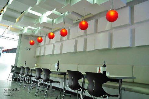En el cielo raso se instalaron unos cubos que simulan movimiento con el iluminado. El piso se materializó con un producto nuevo que simula la melamina, de calidad industrial resistente al tráfico y de tonos claros. Las paredes blancas y el techo con los cuadrados blancos, se combinan con los toques de color rojo de las luminarias colgantes que se instalaron a intervalos regulares.
