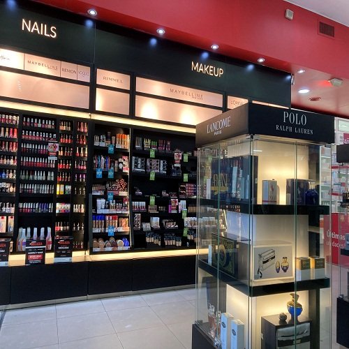 Se pueden observar muebles de color negro, divididos en tres sectores, donde en la parte inferior se encuentran muebles de guardado con cajones, en el centro estanterías escalonadas para los cosméticos y en la parte superior se destina todo lo referente a la gráfica y diseño de marcas.
