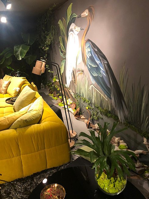 Para esto trabajaron en planta alta, en conjunto con una muralista, quien diseño su mural con pájaros y Alles Grun se encargó de darle textura.