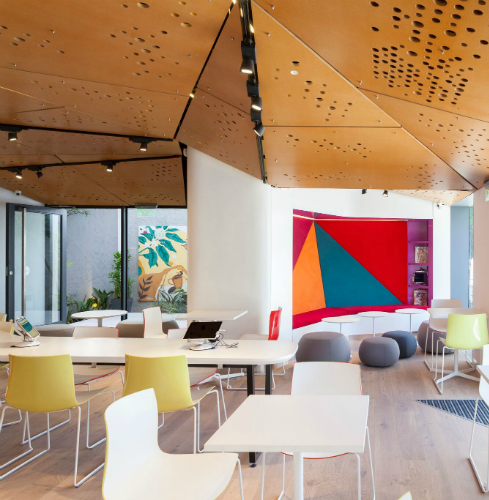 El piso de madera de Tilo no solo se alinea perfectamente con el diseño interior -creativo y descontracturado- aumentando la sensación de espacio y luminosidad en el ambiente, sino que ofrece una excelente performance por su resistencia al alto tránsito y su facilidad de limpieza y mantenimiento. Sin ser el centro de atención, tiene un efecto muy sutil en la atmósfera, transmitiendo calma y tranquilidad, ideal para la pausa del café y la desconexión con el frenesí de la ciudad.
